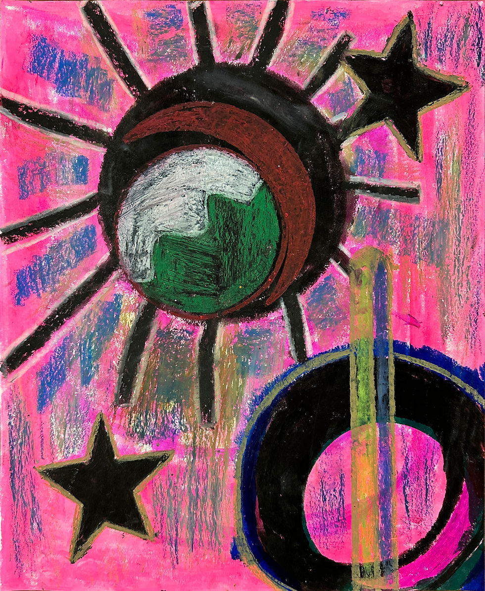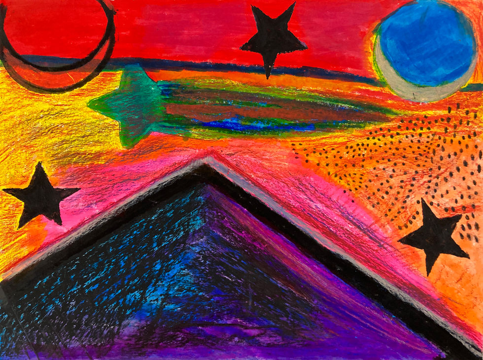 Mark Klapper (b. 1967) makes drawings and paintings that revel in the wonders of nature and the cosmos. He mixes together various paints and pastels and applies stencil and collaging techniques, allowing space for surprises. “It’s almost like a chemistry set,” he says, “always creating something new.” Klapper starts with concrete references - shooting stars, mountainscapes, lightning storms - but he interprets them in a bold, geometric, and highly personal way that veers close to total abstraction. Color, layered in scribbles and blended into vivid auras, is especially significant for the artist. “Blue is my favorite color. When I go out and look at the sky, I wonder what kind of day it will be from the light in the sunlight. My favorite is twilight, just before the sun sets - a nice, peaceful time.”