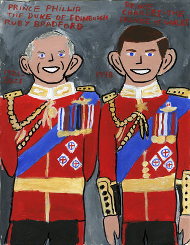 Ruby Bradford (b. 1984) draws and paints in a relaxed, bold style with unrepressed focus on her personal interests: Superman, Prince Charles, and cats. Bold characters and fantastical narrative seem to drive her, though the interest in Superman evidently runs deep. The artists’ mother explained that even at a very young age Bradford watched The Adventures of Superman on television incessantly, and that her first word – “super” was uttered while watching the show.