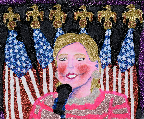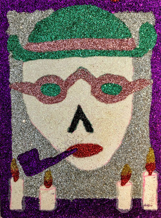 Over time, the work became more and more about glitter, and the studio’s ability to supply the artist with an extensive assortment of glitter colors also led, over time, to an almost exclusively glitter-composition style. By “painting” with glue and applying blocks of color with glitter, Wilson creates spectacular images of celebrities and fellow artists, special commission portraits, and lucky images that express his hopeful sense of fortune and fate. Recently, the artist has been reintroducing elements of acrylic painting back into his images. In 2019, Sereno exhibited his solo exhibition Haitian Symbols and Spirits at the Haitian Musuem located in Chicago’s Uptown neighborhood.